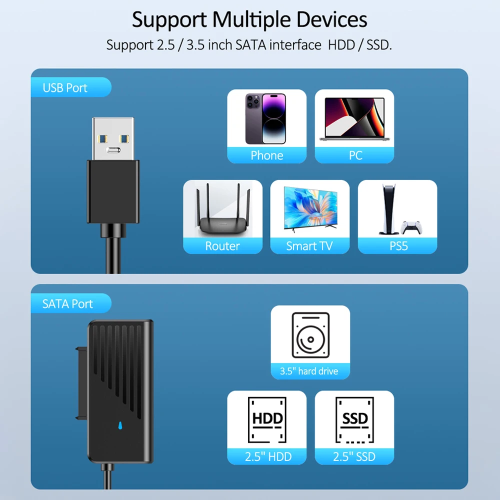 Com plugue UK, plugue EUA, plugue UE:É um drive USBOpção cabo + carregador, Adequado para discos rígidos de 2,5 polegadas e 3,5 polegadas,Sem um slot M.2 cartão!
