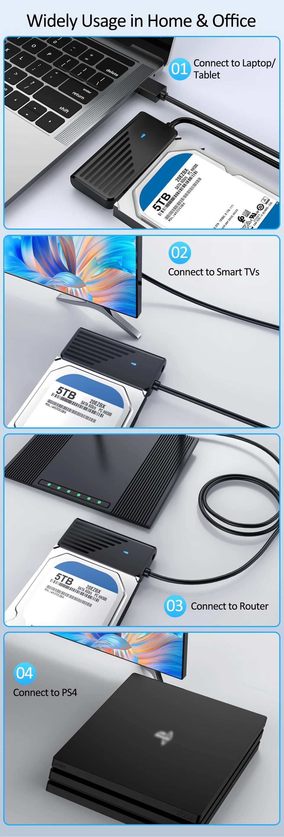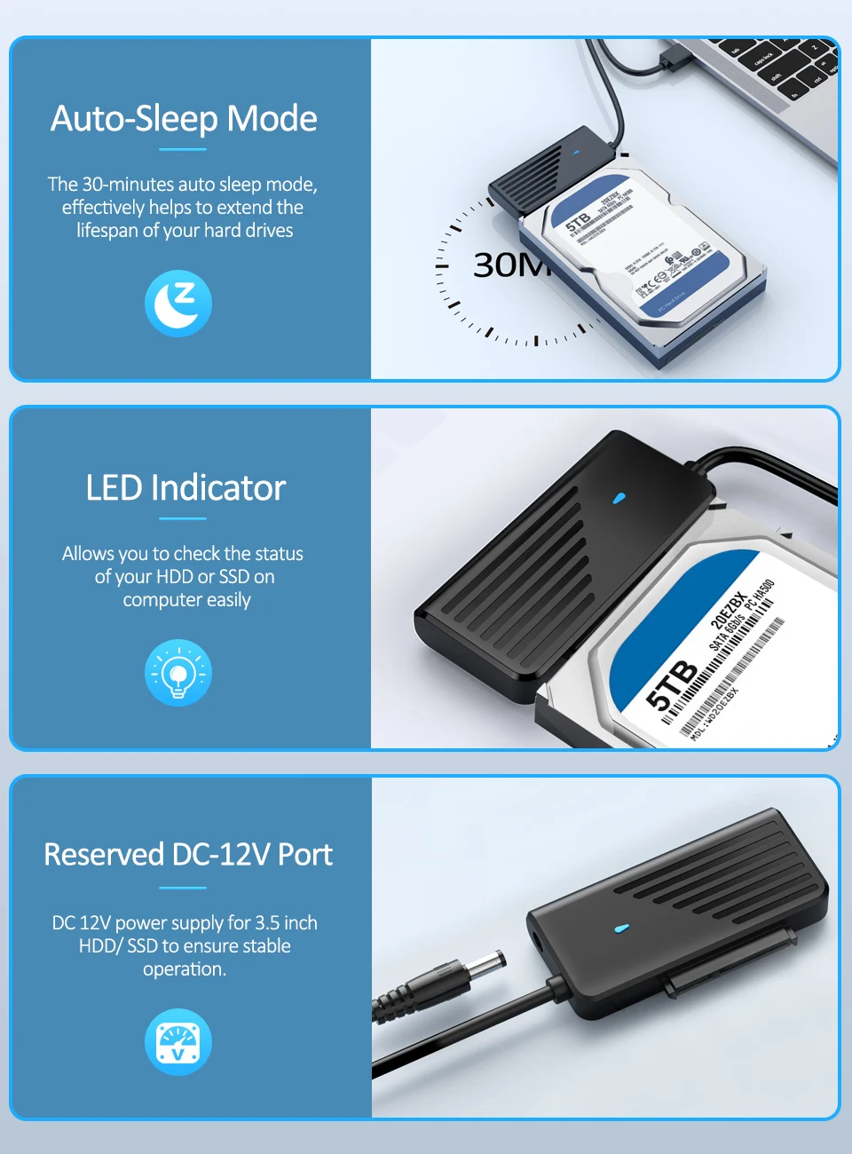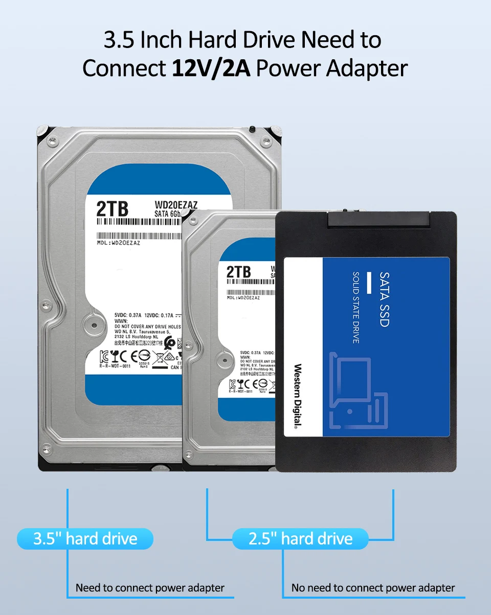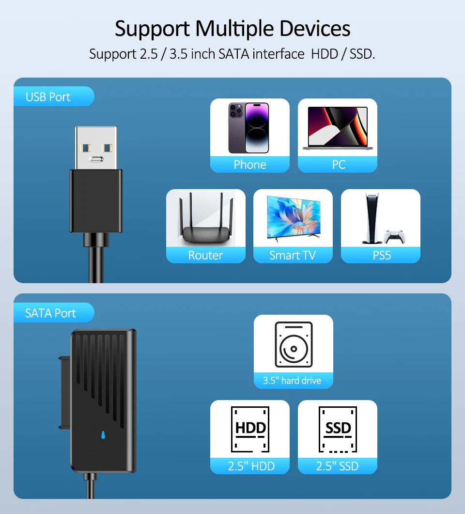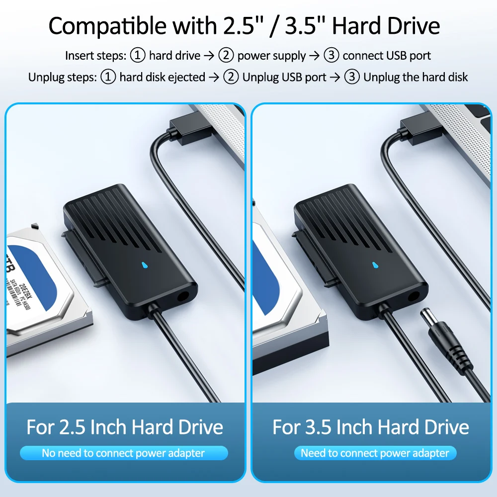 3. Suporta leitura de disco rígido de 2,5/3,5 polegadas e leitura de disco rígido de 3,5 polegadas requer adaptador externo 12V/2A;