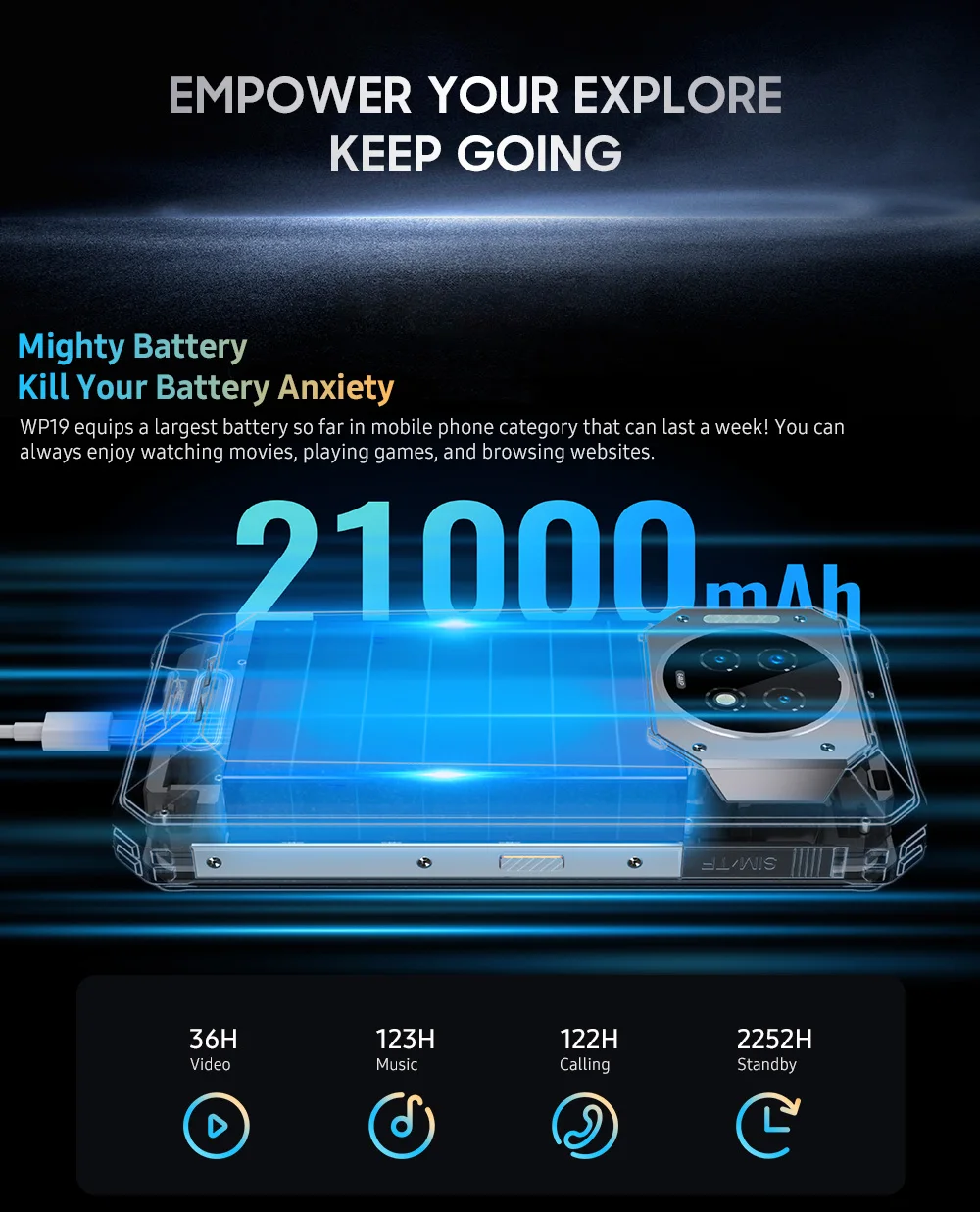Oukitel wp19 está equipado com uma bateria a maior até agora na categoria do telefone móvel que pode durar uma semana! Você sempre pode desfrutar de assistir filmes, jogos e sites de navegação