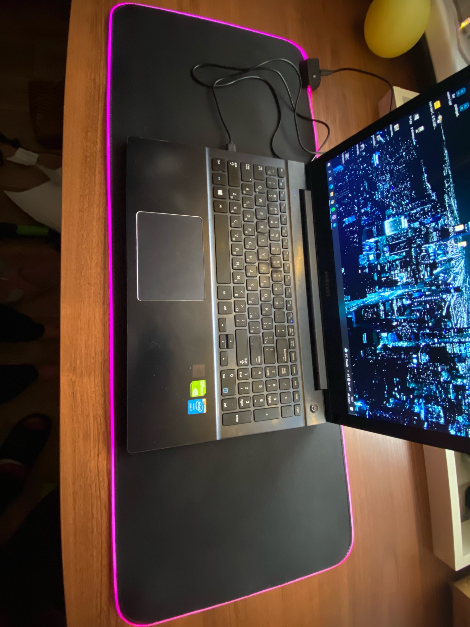 Chic material, from above pleasant to the touch, from below rubberized (does not slip on the table). The controller connects via a micro-USB cable to a computer. Counted at least 8 different modes-from single-color to smooth transitions. Switching occurs by pressing the button on the controller. I recommend this product.